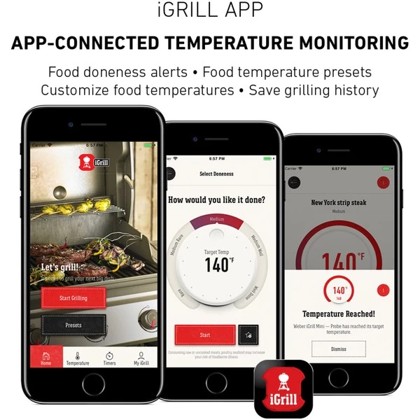 | Features | Grafische Darstellung und Übertragung der Daten in Excel, gleichzeitige Anwendung mehrerer iGrill Thermometer möglich, Verbindung zu Rezepten über Weber App, Verbindung zu Social Media (Facebook, Email, SMS…), Weltansicht mit eigenem Standort | ||