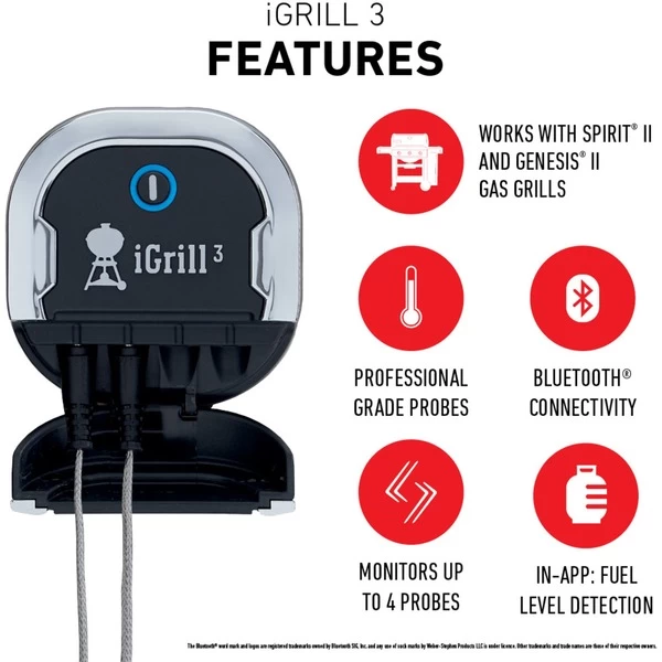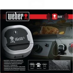 Dieses vielseitige und innovative Thermometer verbindet sich via Bluetooth mit der kostenlosen Weber iGrill-App und misst sowohl die Kern- als auch die Temperatur in der Grillkammer. Man hat die freie Wahl – voreingestellte Werte nutzen oder eigene Werte festlegen. Das Thermometer enthält 2 Messfühler und ist für bis zu vier Fühler geeignet. Neben der Bluetooth Verbindung zum Smartphone oder zum Tablet besteht nun auch die Möglichkeit des Social Networking. Innerhalb der iGrill-App haben Nutzer nun auch die Möglichkeit, ihre Grillerlebnisse z.B. durch das Veröffentlichen von Fotos zu teilen. Auch der eigene Standort kann markiert und auf einer Weltansicht angezeigt werden. Jedes iGrill Thermometer kann durch die Magnethalterung am Gehäuse bequem am Grill befestigt werden. Mit dem iGrill 3 ist es sogar möglich, die Beleuchtung am Genesis II LX aus der Ferne zu steuern. Außerdem ist das iGrill 3 Thermometer wetterbeständig und kann daher am Grill verbleiben.Art.-Nr.: 1303167